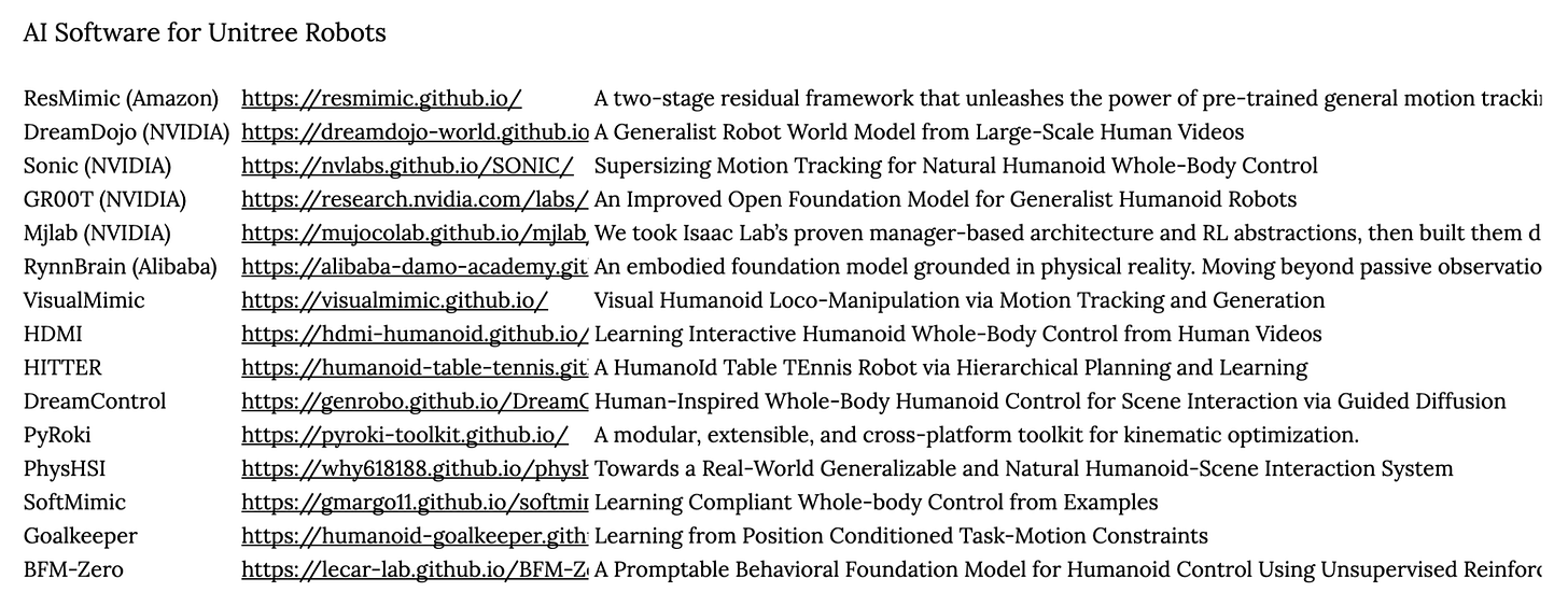 3️⃣ ¿Por qué han tardado tanto en Unitree en demostrar las capacidades de su IA Física? a saber, pero la salida a bolsa de la empresa a lo largo de este año podría estar demandando que la empresa demuestre capacidad propia en materia de software, no sólo de hardware. Aquí hay que fijarse en la cantidad de laboratorios que usan este robot para hacer las pruebas de sus desarrollo de IA Física, con Amazon, NVIDIA y Alibaba entre otros muchos.